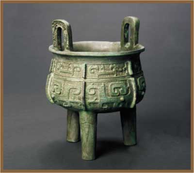 羊鼎通径17厘米,高23厘米,重3公斤。殷墟晚期鼎的造型中出现了一种束颈、曲壁的新形式,此鼎即是其典型的代表。鼎的两耳三足安排十分妥帖,整个造型富于稳重感。在器物的颈腹部分别装饰对称的回顾式鸟纹和兽面纹,衬以细密的雷纹。纹饰线条深刻劲锐,范铸极精,使粗犷的兽面和精细的雷纹水乳交融。