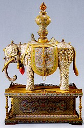 此珐琅象通体铜胎镀金。象四足直立,卷鼻垂尾,背负鞍垫及宝瓶,寓意"太平有象"。下设带栏束腰长方座。瓶、象、座均錾饰勾云及缠枝花卉纹,填彩色珐琅釉。垫左右饰云龙纹,是用掐丝珐琅做成。此象为佛堂供器,共两件,它是其中之一。广州制造,于乾隆十一生(1746)由两广总督李侍尧贡奉。