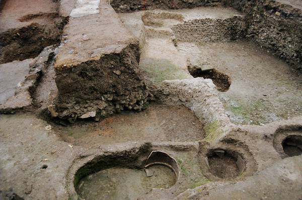 第五期:以开口于二层下的一水井中出土器物为代表。以青釉、白釉为主,还有一定数量的钧釉,这期代表器物有青褐釉双耳鼓腹罐、青褐釉敞口深腹碗、青褐釉浅腹盘、天蓝釉红斑直口小碗、素胎深腹盘、白釉草书“青”字碗和白地黑花盘等。这期年代为元代。