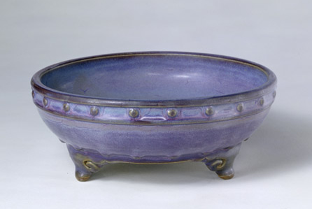 洗作鼓式,亦称鼓式洗。器身上下饰鼓钉二周(上22枚,下18枚),其下承以三如意头足。洗内施天蓝色釉,外为玫瑰紫色釉。底刷黄褐色薄釉,绕底一周有支烧痕,并刻有“一”字标记。河南禹县钧台窑址曾发现刻有“一”至“十”数目字的钧瓷标本,与故宫博物院收藏的官钧窑瓷器相同,此类数目是同类制品从大到小的编号。