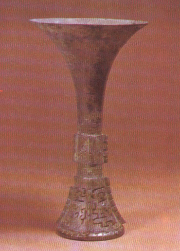 觚,是一种饮酒器,盛行于商代,其基本形制为长筒状身,大喇叭形口,斜坡状高圈足。据专家考证,饮酒时如需温酒而饮则用爵,不需温酒而饮则用觚,所以觚、爵常配对而出,成为当时礼器组合形式的核心。