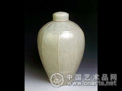瓶有盖,小卷口,短颈,上小下大,丰肩,腹作八棱形,短圈足,盖顶部印一牡丹花,肩和胫部分别刻覆莲和仰莲纹。瓶腹八面模印花卉图案,外施青白釉,稍泛黄色,瓶内和足无釉,胎灰白,纹饰刻印相结合,线条流畅清晰,造型俊美。