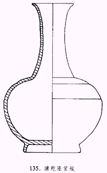 盘口长颈瓶 辽代典型器之一。器呈浅盘口,细长颈,溜肩,敛腹,底足外展。有的器底划有"官"字款。同样这种器身,肩、腹饰贯耳者,称为"盘口穿带耳背壶";肩侧有注流者,称为"盘口长颈注壶"。装饰方法有素面黑陶压光、白釉、黑釉、褐釉、黄釉、绿釉等釉色或刻花。