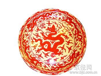 元代釉里红瓷器的胎质一般呈灰白色,因为采用的是麻仓土。元代瓷器的白釉,色白闪青,莹润透亮,但施釉有厚薄不均现象,厚的地方能看到明显的蛋青色(卵白釉);浅釉中往往显淡牙黄色。这种以青白釉为主的釉里红瓷器产量非常稀少,能流传到今天的器物也就更加少有了!元代釉里红在放大镜下有时能看到极少的淡淡的绿色。而青花釉里红是指在同一器物上先用钴料和铜料绘彩,再罩透明釉,在高温下一次烧成的瓷器。由于铜红和钴蓝所需要的温度不同,能同时呈现出两种不同的色调,就更加困难了。在今天的传世品中,极少有两种颜色都十分鲜艳的器皿。上图所示的釉里红巨盘其直径为1.5米,是近日由一位爱国华侨徐耀先生捐赠给中古商国际收藏俱乐部的。这只巨盘以它独特的风格和别具匠心的工艺显示出元代釉里红工艺的风采。