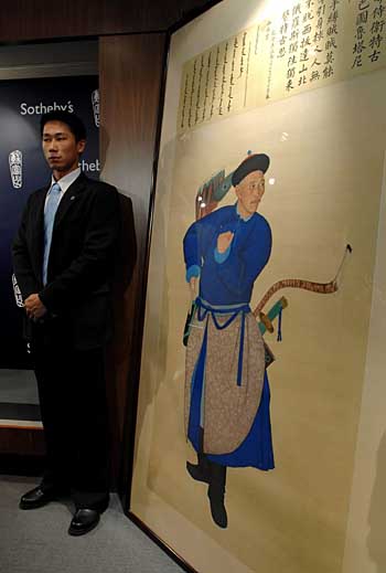 图为清乾隆帝御制的“平定西域紫光阁五十功臣像赞头等侍卫勇巴图鲁伊萨穆”的设色绢本挂轴,估价超过1200万港元。