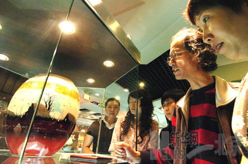 9月21日,江西省工艺美术大师方文贤(右二)在北京王府井景德镇陶瓷城向观众介绍他的作品——色釉彩绘“初春”瓶。