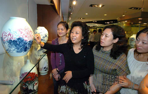 9月21日,江西省工艺美术大师王淑凝(前左二)在北京王府井景德镇陶瓷城向观众介绍她的作品——青花斗彩瓷瓶《富贵图·红牡丹》。