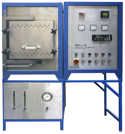 Industrieofen公司开发出一种新型高温炉(见下图)。该高温炉采用陶瓷纤维和石墨毡作为隔热材料和内衬,炉膛内有旋转叶片泵,真空气密性好。高温炉的最高使用温度为1820℃,可持续使用温度为1800℃。保护气体可为天然气、氮气、氩气。加热元件采用钼,钨或石墨等材料制成。该高温炉是一种能广泛应用于各种材料热处理的优质高温炉。