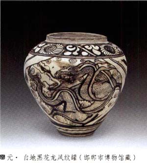 磁州窑至清代末年,白地黑花制品呈下降趋势,转入民间青花占统治地位的时代,大量传统技术失传,技法绝迹。我们可以从认识此阶段陶瓷风格与工艺手段入手,从当时原材料特别是胎质与釉质上加以区分。因为仿制者不可能摆脱此时期工艺特征的制约,特别是带有微乳浊白釉色调的“水冶釉”的广泛使用,而宋、元白釉与它有质的区别。当然还可以从众多的工艺手段上找到众多的分辨要素,如造型、装饰在古代是十分考究的,此时依样描制,马虎走样造成失去灵感。古代装饰率真朴实、奔放潇洒,而此时过分粉饰美化,工艺操作上生涩,因此形成对比。