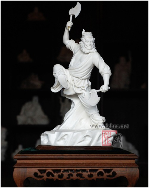 “身披银铠软甲,丈八蛇矛紧挺,霜花骏马频嘶……”,甩动四蹄,奔跑中的战马,飞扬的马蹄似乎还带来一阵撕杀声——这就是我们在邱双炯大师的陶瓷雕塑研究所看到的《水浒传》108将之一林冲的陶瓷雕像。从表情姿态到衣褶,细至环环相扣的缰绳,以何朝宗为代表的一代宗师们创立的德化民间传统陶瓷雕塑艺术形式和塑造技法,把好一个梁山好汉林冲的英姿塑造得威武生动、展示得淋漓尽致。
