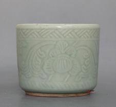 清咸丰 景德镇窑豆青釉刻牡丹纹筒式炉