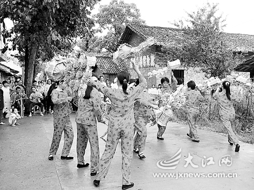 “十一”期间,上高县充分发挥具有本土文化韵味的特色文化优势,进村入企,与群众共度国庆佳节,欢乐遍及全县城乡的每一个角落。图为该县镇渡乡花灯队在苑新村为村民表演《闹花灯》。杨德峰 本报记者罗德斌摄