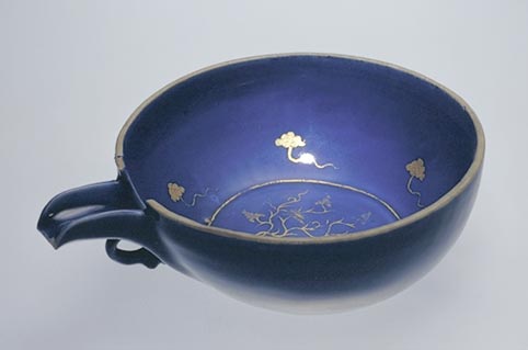 器圆形,敞口,浅弧腹,平底,口一侧有长方槽形流,流下一小系。胎细薄致密,釉厚润而不均匀。口和外底无釉。器内绘金彩宝相花,器壁画5朵金色祥云。