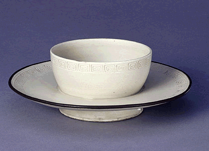 盏托上呈杯形,口沿无釉,托镶铜口,圈足外撇。里外施白釉,杯口与托口沿各饰回纹一周。