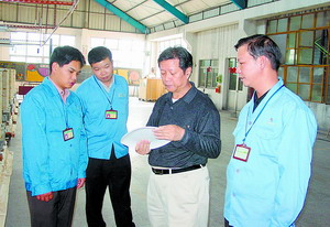 陈显彬(右二)在生产车间与工人一起研究产品质量。