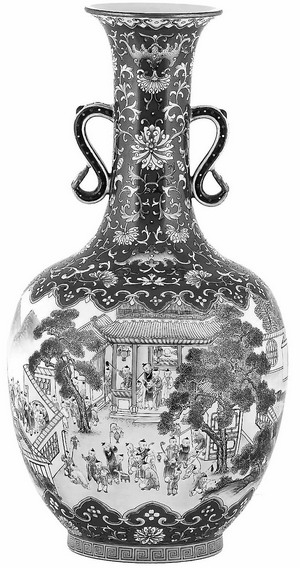 乾隆时期的粉彩有如下特点:1.乾隆粉彩利用粉彩粉润柔和的质感,用粉化的各种彩料仿制各种工艺品,能准确地表现出所仿之物的色彩和质感,可谓惟妙惟肖。2.乾隆粉彩有一个独有的特征,即器物口部及底部都施松石绿釉。松石绿釉非常浅淡光润,釉面犹如粥皮,由于是一种低温彩釉,釉面常常带有细小的纹片。3.乾隆官窑粉彩的纹饰一般是“大内”送来的图样,主题纹饰按不同时节都有严格规定,主纹是缠枝花,分别加施变龙、变凤、蝙蝠或缨络、八吉祥等,组成各种祥瑞吉庆、美意延年内容的图案。4.乾隆粉彩的造型工艺更是精益求精,不论是高达一米多的大型陈设瓷,还是小至几厘米的扳指儿、鼻烟壶,造型都非常规整,很少出现夹扁或歪塌现象。 此件清乾隆粉彩春灯婴戏双耳瓶为乾隆粉彩的代表作品,无论从色彩、器形、工艺上都有很大的特点,尤其在文化内涵上更是反映了封建帝王希望“百子千孙”、“江山永固”的思想。同时也反映了千百年来劳动人民盼望有子传宗接代的良好愿望。此瓶细长颈,撇口,耳作如意形,喻“平安如意”,硕腹,平底,矮圈足,口及耳描金,颈至肩及腹底以如意云头为边,在红地上画缠枝番莲间饰蝙蝠。腹部彩绘高山流水,庭舍楼台,配以树石花草,众婴孩嬉戏其间,或舞龙或提灯,足边描回纹,器内及底均施湖绿色釉,底描红书“大清乾隆年制”六字篆款。