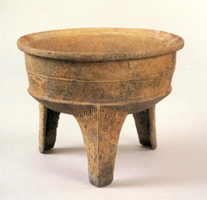 鼎是古代传统的炊器,绵延使用数千年。这件鼎形制厚重庞大,宽口沿外折,可承盖。直壁深腹,圜底下残留黑色的炊煮痕迹。鼎的足部设计非常有特色,剖面呈直角曲尺形,具备优良的承重性能。