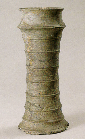此瓶高23.8厘米,口径8.6厘米,泥质灰陶。侈口,凸肩,凹弧形腹,下有三个扁方形矮足。器身饰竹节形凸棱七周,宛如一段竹节,简洁明快。
