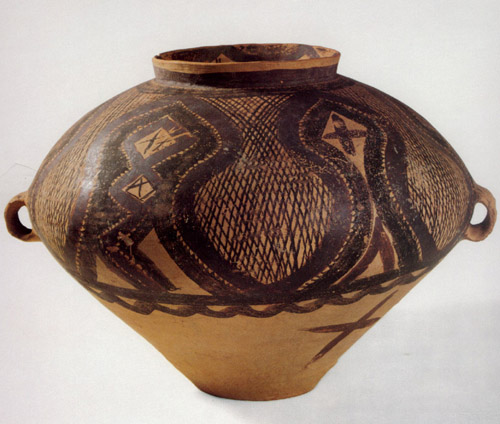 此壶泥质橙黄陶胎。造型饱满。图案风格淳朴。所绘壶形纹、锯齿纹为半山型彩陶大型壶、瓮器上的典型纹饰。