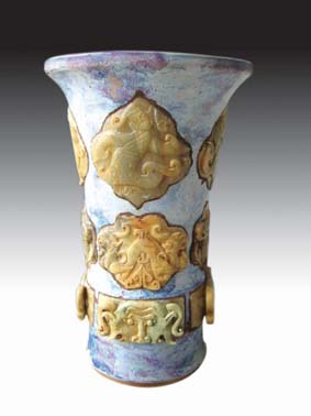 钧窑是宋五大名窑之一,与汝、官、哥、定诸窑并驾齐驱,此件宋官钧窑镶玉大花觚(见图),体形硕大,造型优美,撇口,直腹,圈足。尤其值得关注的是,在通高38厘米、口径23.5厘米的觚体四面,镶嵌着12块古玉,觚底圈足内凹,施酱色护胎釉,并在底面以金粉刻画了一只金虁凤图案。   觚在中国古代青铜器时期即产生,以后逐步沿袭至陶器、瓷器,属于古代的盛酒器,有圆形、方形,以圆形器为多见。此觚的雍容华贵在于觚上镶嵌了12枚高浮雕古玉,3枚一组,共四面十二枚,玉件依据圆形觚的弧度精雕细作,然后粘贴于觚体上。