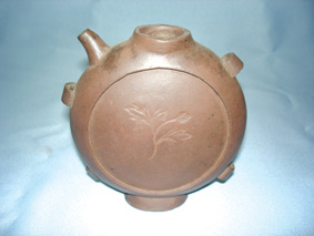 此壶为清早期之器,原型应是早年北方草原游牧民族跨在身上随时饮用之器,而后又为军旅携带用品。故此器中使人感觉到有一种慓悍骑兵之气息。