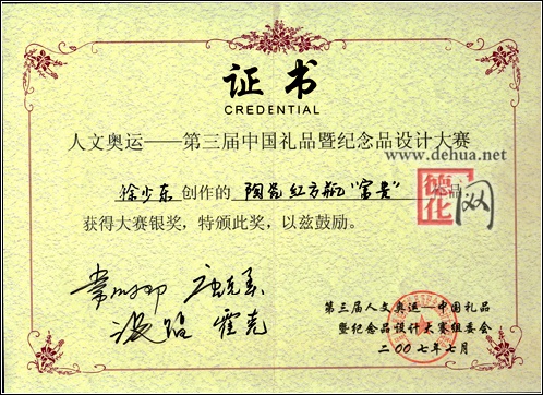 日前,人文奥运——第三届中国礼品暨旅游纪念品设计大赛落下帷幕,来自中国瓷都——福建德化县的富贵红名瓷“富贵”方瓶获大赛银奖。