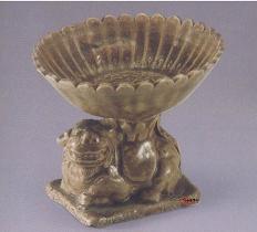 这件金代青釉狮形灯盏高9.5厘米,口径10.5厘米,底径7*5厘米。灯座为卧狮状,狮子张嘴露齿,回首左视,耳、鼻、须、眼等刻印清晰;狮四肢前屈,尾上翘,卧在长方形底座上,形象颇为生动。狮背上置一圆形盏,盏为菊瓣形口,有30余瓣,盏内印花,盏心为折枝牡丹纹,盏壁模印莲瓣纹。灯盏通体施青釉,釉色姜黄,有开片,釉薄处显胎筋,胎色灰白。底足无釉,有一孔。一盏之内以菊、莲、牡丹三种花卉装饰,很是难得。 此盏现藏于甘肃省博物馆。