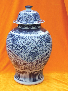 军罐,是因其体形硕大、造型饱满、气魄雄伟酷似一位头顶缨盔的将军而得名。从元代由短颈大腹的无盖大罐到明代的荷叶盖罐逐渐演变形成,从存世的实物来考证,真正成熟的将军罐是从明代嘉靖、万历时期开始,到了清代康熙年间官窑、民窑大量烧造。清代中后期更是备受推崇。将军罐也由实用器皿逐渐发展为用来陈设装饰、供奉避邪的艺术品。图中这对清代中期的缠枝花青花将军罐高45厘米,直口、丰肩圆胸,腹部渐收,器型饱满,整体就像两位戴盔披甲壮年的将军,器型稳重挺拔,威猛刚健。青花图案自上而下共分七层,盖子顶是蓝色的围棋钮,往下用青花绘出2朵枝条纤细修长、花朵丰满的缠枝花,在盖子的折沿上用泼墨留白的手法绘出半隐半现的梅花,花朵分内外两圈。罐子的颈部是连续的如意纹,肩部用青花绘制的如意头花边披肩。作者在罐子的胸部与腹部巧妙地运用写意的线描手法绘满了浓淡相间的缠枝花,委婉流畅的曲线将花朵与叶子表现得婀娜轻巧。腰部以下是变形的回纹。这种庄严威武的造型与浪漫娟秀纹饰巧妙的配合,逐渐成为了大众非常喜爱的风格,这也是从清代乾隆开始一直到清末青花瓷上较为流行的典型纹饰。在对大量的新旧陶瓷标本分析中发现,新瓷的表面光泽与旧瓷的光泽存在着明显的区别:古陶瓷的光泽由强到弱(逐渐切弱),虽然显得暗淡,但过渡逐渐,比较自然。这对青花将军罐的青花发色凝重、淡雅,图案的边缘比较朦胧、柔和。因为在上百年的岁月里,釉子因不可避免受到磨损、风化、侵蚀而发生老化,釉子表面与内部的老化与劣化改变了釉子的光学性能,釉子表面的光泽降低内部的光泽加强,清晰度与透明度不断下降,最后变成了一层毛化膜层,在毛化膜层的作用下,古陶瓷釉下的图案也会变得柔美、凝重、典雅。特别是图案的边缘比较朦胧、柔和。而那些新仿瓷釉下的图案就显得清晰、单薄,缺少立体感,特别是图案笔画的边缘比较锐利、清新。在这对青花将军罐盖子的钮上能看到比较明显的磨损,损伤是多年自然使用的痕迹,这个与人的使用习惯和器型有很大的关系。一般使用时人手经常摸触的地方以及放置时陶瓷与放置经常接触的地方往往磨损比较严重。凡是人手经常触摸的地方多是陶瓷器型凸起的外沿的“峰部”,触摸较少的地方常是陶瓷器型凹陷的内缩的“谷”或“沟”部。“峰部”越突出,凸起就越常受到磨损其光泽就越暗;无论新瓷经过怎样人为的打磨、去光,破坏的多是外部和外表,只是造成了表面的粗糙,它里面没有被破坏的地方发光还是很亮。而古陶瓷的表面结构的破坏和改变是一个渐进的漫长的过程,它遭受到的破坏是长期的。近年来随着收藏市场的火爆,将军罐成了收藏家们竞相追逐的目标,但与花瓶等其他古玩不同,将军罐是由罐子与盖子两部分组成,在百年的流传过程中大多数身首异处,特别在文革“破四旧”的年代又因体积太大难以藏身而大量被毁,完整的传世品较少,所以这一对原配的、完整无缺的清代缠枝花青花将军罐更是稀有,弥足珍贵。