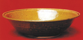 闽北私人收藏的一只五代酱黄釉唇口大碗 见图 ,高5.8厘米,口径20厘米,足径10厘米,造型显得宽矮、规整、轻巧,厚唇,口沿外翻,碗壁略显斜直,胎壁较薄,宽矮圈足,见坚致的灰白色胎,碗内壁底见圆形涩圈无釉,而涩圈内中心有釉;圈足及足端无釉,而圈足内又满釉,并见弦刷釉痕。内外壁均施满酱黄色釉,开细小冰裂纹。碗外壁见施釉不匀之缩釉点,釉薄处可见壁上的轮制弦削痕以及近底足处的竹片刮削痕。