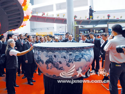由景德镇龙凤陶瓷文化发展公司出品的“盛世名花”青花陶瓷大缸,10月18日正式在瓷博会开幕式上亮相。该瓷缸直径1.66米,高0.8米,由景德镇陶瓷技师余鹏飞手工拉坯、河北著名画家、“中国牡丹王”崔廷玉绘画,堪称当今世界之最。