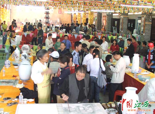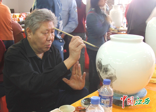 10月19日,中外陶艺家现场技艺交流表演在景德镇“中华陶艺村”展开。图为中国陶瓷艺术大师刘平在现场作画。(中国江西新闻网记者 钟海泉 摄)