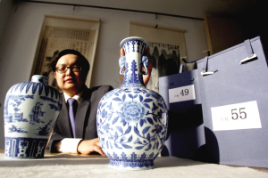 图为清乾隆青花成化式挟琴访友图梅瓶和清乾隆青花茶花纹太平有象观音瓶。本报记者 欧阳晓菲 摄