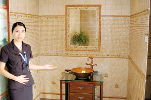 邝意平首先介绍的是“流金岁月”系列,记者所看的第一印象就是这些暗黄色调的陶瓷在灯光照耀下,会不时有“闪亮”出现,“没错,这就是这款产品的最大特色,它是在陶瓷表面镶嵌金属片,以达到特别的装修效果。”