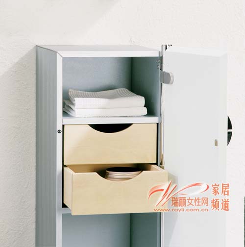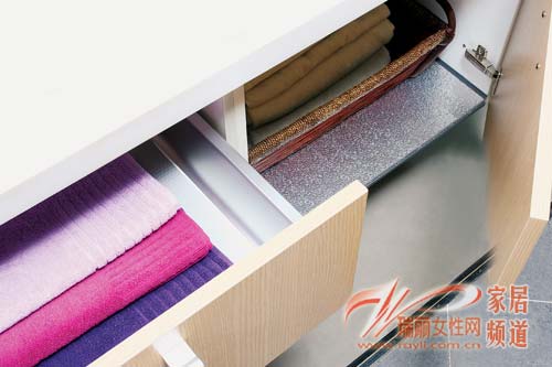根据自己的平时沐浴经验,我们会发现浴室内面盆或水龙头遇到热气会产生大量的冷凝水,这些水会顺着台面流入柜子底部,引起柜体发霉变形。如果能及时在柜体底部加上一层防水铝箔或是橡胶垫就能解决这个难题,把它们垫在抽屉底部,在防潮的同时还能固定浴品。