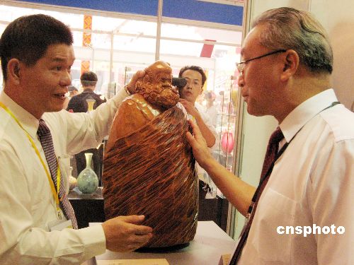 十月二十七日,亮相第二届海峡工艺品博览会的“台湾馆”吸引观展者。作为本次博览会的协办单位,台湾苗栗县三义木雕协会带来台湾二十多位木雕刻艺术家的三十余件作品,希望让更多大陆的木雕爱好者认识台湾木雕,分享台湾木雕文化。 中新社发 张彩林 摄