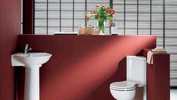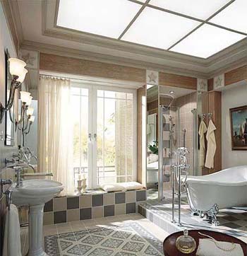 典型的乡村休闲的卫浴空间。仿古磨边表面的墙砖、遍野薰衣草的泥土色泽,都呈现自然粗糙的纹理和颜色,自然但绝不简陋.