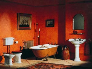 内壁带有花案的洁具十分漂亮,但由于洁具本身是白色的,不宜将它们安置在素白色调的环境里,红色墙砖环绕黑色墙砖背景墙却能将内壁上的花案衬托得更醒目。