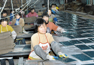 昨日,在宜阳龙翔建材有限公司瓷砖生产线上,工人们正忙着将瓷砖分级装箱。该公司投资9000万元建成的这条生产线,长达500多米。其辊道窑长达280多米,是目前国内最长的辊道窑。