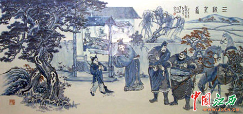 杜浩生介绍说,大瓷板烧制难,构思绘制更不易。画釉下青花工笔人物画不仅要功力,对耄耋老人更需要体力和毅力;之所以选择《三顾茅庐》这个历史经典题材,是因为人才问题不仅是历史,更是社会现实问题,是构建和谐社会,建设创新社会都迫切需要各种各样的人才。