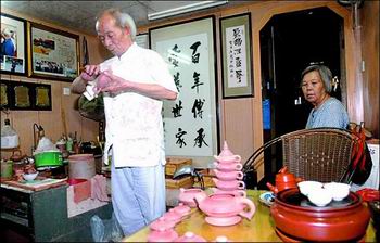 73岁陶瓷艺术大师吴瑞深(左)技艺精湛,他创作的潮州手拉朱泥壶得到国内外客商的青睐,也使更多的人领略到潮州陶瓷的深厚底蕴。