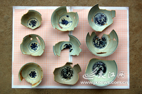 此次发掘出土的文物内容比较丰富,涵盖陶瓷作坊遗迹、房迹、制瓷工具遗迹以及大量瓷器标本。瓷器标本以青花瓷为主,还有白瓷、蓝釉、紫金釉和釉上彩等,主要为碗、杯、盘等生活用瓷。青花瓷纹饰题材丰富,有人物、花卉、花鸟、山水纹样;款识有“福”、“富”、“万福攸同”、“大明年造”、“宣德年制”、“成化年制”等。景德镇陶瓷考古研究所副所长江建新介绍,此类款识均系首次发现,其中一书“癸丑年制”青花纪年款和书“蓝氏自造”私家作坊款瓷器标本尤为珍贵。在发掘现场,他告诉记者,根据现有的出土文物和资料记载可以判断,这个窑址在康熙以后才停烧。