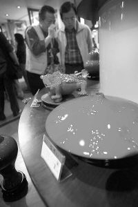 11月17日,市民们正在观赏德化名瓷“富贵红”瓷器。当天,富贵红高温红釉艺术瓷在刚刚取得授牌的厦门市富贵红营销中心展出。