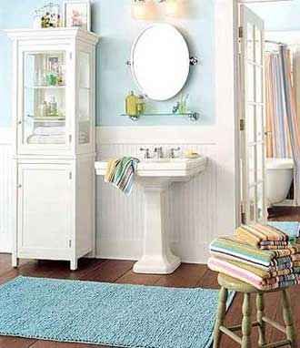 此外,针对卫生间中常见的其它一些角落我们也可以加以利用。我们可以在柜橱门面上安装镜面,用来贮存一些卫生用品,卫生间常常设置柜橱,或者在墙面上做壁柜。如果在柜橱或凹槽的门面上安装上镜面,不仅使卫生间空间更宽敞、明亮,而且豪华美观,费用也不贵,更可以与面盆的台面结合起来,作为梳妆台镜使用。还可以在在浴缸周围的墙壁上打一个七八厘米深的凹洞,再铺上与墙壁相同的瓷砖,此洞可用来放洗浴用品等东西。这样扩大了使用空间,使用起来也方便、自如,看上去卫生间井然有序。对老人、病人或肢体残疾的人来说,弯腰、站立等动作是比较困难的。因此,若有一些可以支撑的东西对他们将有莫大的帮助。这时,在紧靠抽水马桶的墙壁上安装扶手,将大大方便他们的生活。抽水马桶的冲水槽上方是平时使用达不到的地方,我们可以利用此空间做一吊柜,深度约15厘米左右,不致给人造成不便。柜内可放置卫生纸、手巾、洗洁剂、女性卫生用品等,也可在下部做成开放式,放些绿色植物装饰。
