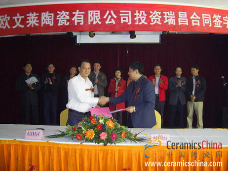 本网讯 特派记者 商超兵 摄影报道 11月21日上午,广东欧文莱陶瓷有限公司与江西九江瑞昌市政府签约了一项总投资为10亿元的陶瓷投资项目。瑞昌市市委书记刘韵和、市长熊起栋、佛山市陶瓷行业协会秘书长尹虹、广东欧文莱陶瓷有限公司董事长梁伟鸿等领导及嘉宾出席了此次签约仪式并发表了讲话;瑞昌市政府四套班子领导和市直单位、乡镇领导以及欧文莱公司的高层人员共同见证了这次两地“联姻”。