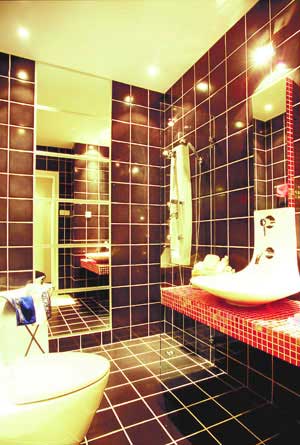 设计师在设计中将各种因素集中考虑,进行合理搭配,让材料与设计合而为一,表达心情,表现生活。大胆使用黑色与红色,使卫浴空间改变以白色为主的千篇一律,赋予空间冷峻成熟的气息,清凉中不失浪漫。
