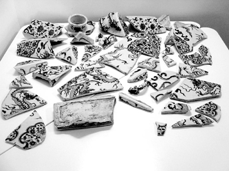 3个月前,一个收藏界朋友抱着这样一具扁壶来找他,扁壶伤痕累累,表面的裂痕碎成哥窑一般,有些地方还有缺损,留下五六个小洞。蒋道银接受了这个挑战。他先将原件拆碎,一一清点,居然有40多块。然后用药水仔细清洗,再像拼图游戏一样拼装起来。还得内外兼修——先修一部分内部,再修一部分外部,一层层修到口部。用的是强度很高的进口胶水,缺损处一一补上。更难的是用低温仿釉材料将表面做平,还得用画笔将青花图案补齐。大家知道元青花图案粗中有细,笔意恣肆汪洋,予人雄浑大气的美感,这也是元青花的时代特征之一,今人书写的材料与环境都发生了很大变化,要接通700年的时代气息确实不容易。好在蒋道银是老法师,数十年的修炼,早已得道,他懂得如何向元代的工匠借几笔精神。如此,修了3个多月,他总算松了一口气。