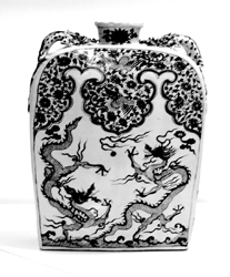 在元青花瓷器中,有一款四系扁壶,式样相当独特,它小口卷唇、溜肩、体呈扁长方形,肩部两端向下垂到底,长方形砂底,两肩各塑贴两条龙,个别也有无系者或一对环形系。此类扁壶为元代特有,具有浓郁的异国情调,并非中国传统器物造型。可以想象的是,在成吉思汗的马队向欧洲大陆飞沙走石进发的过程中,随军工匠们从西亚和欧洲的器物中捕捉到了灵感。这种中西文化的交流在中国的家具与建筑中也有不少例证。