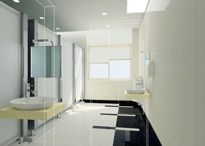 客卫采用了暖气片的取暖方式,为了让浴室里充满着温馨,设计师在色彩和灯光上也下了功夫,屋顶上方模拟了一扇别墅才有的“天窗”,灯光从天蓝色的冰裂玻璃中透出,让人仿佛随时都能与蓝天、白云对话的感觉。而墙面铺设的米黄色的瓷砖,则传递阵阵暖意。