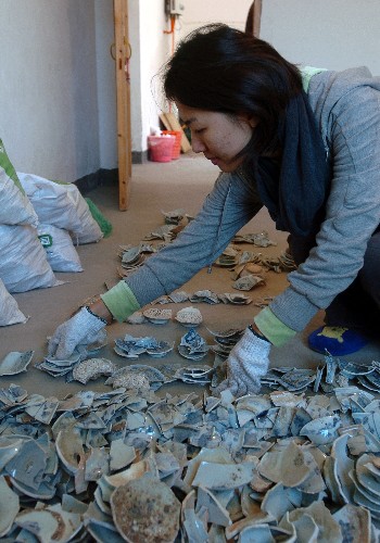 11月27日,北京大学的韩国留学生金志园在整理陶瓷碎片。新华社记者 章武 摄