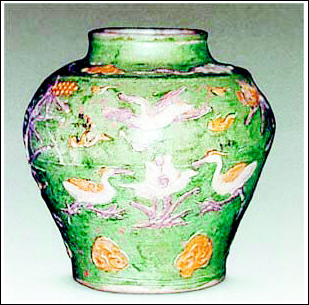 泰州博物馆藏有一件从明代墓葬中出土的素三彩堆塑雁纹瓷罐,这件三彩罐高15.1厘米,口径7.l厘米,底径9.2厘米,唇口微外翻,短直颈,鼓腹,下腹渐收,近底处稍外撇,平底,细白胎,腹部有一圈胎接痕,最大半径偏于上部,显得圆润丰满。罐内部施白釉,外部满刷草绿色釉,罐身堆塑黄、紫、白三色釉装饰的芦雁、云彩、莲花等图案。从造型、胎接工艺及纹饰分析,应为明代中晚期景德镇的产品。